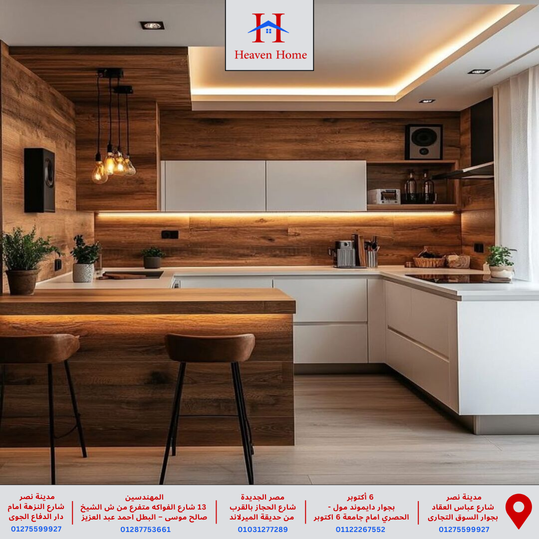 في هيفين هوم بنقدملك مطابخ خشب مودرن تجمع بين دفء الخشب الطبيعي وجمال الخطوط العصرية